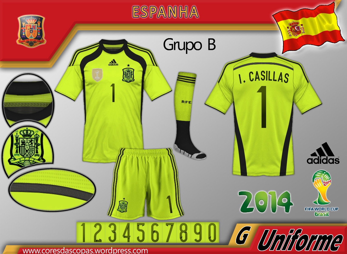 Os uniformes de goleiro produzidos pela adidas para a Espanha ficaram muito bonitos e têm cores personalizadas (o template é o mesmo para todas as seleções).