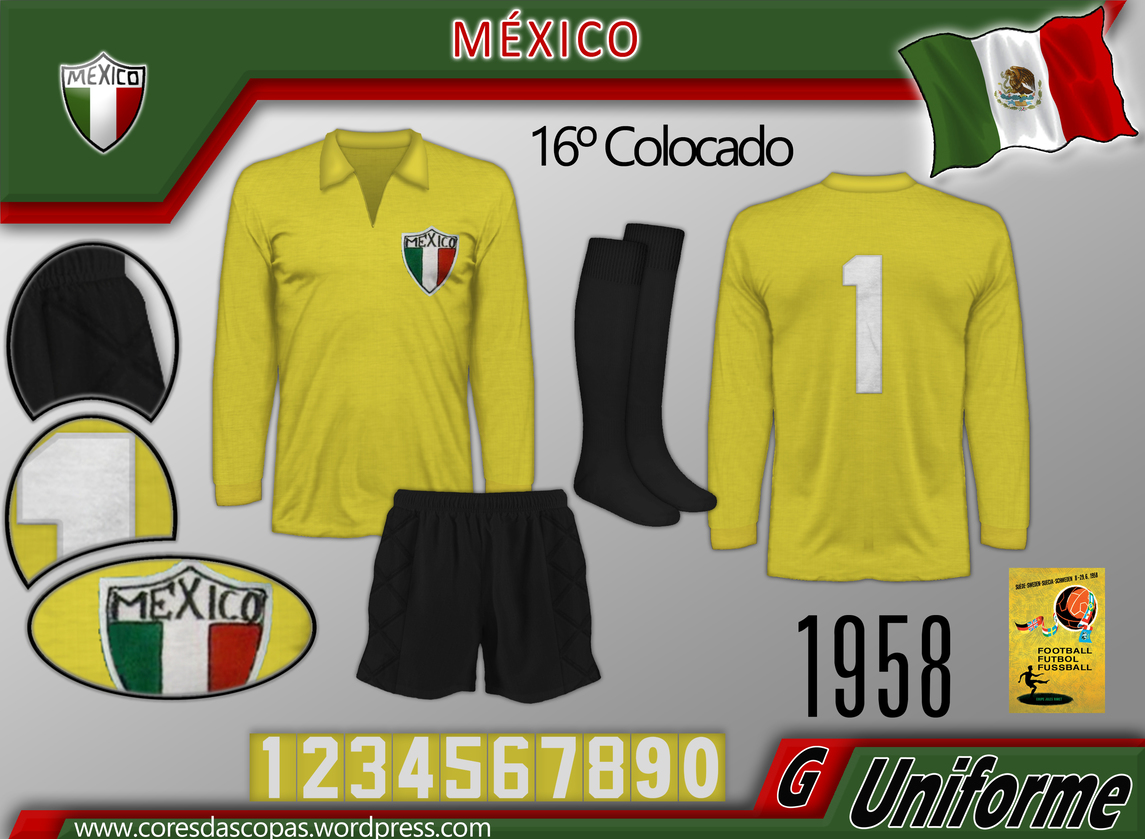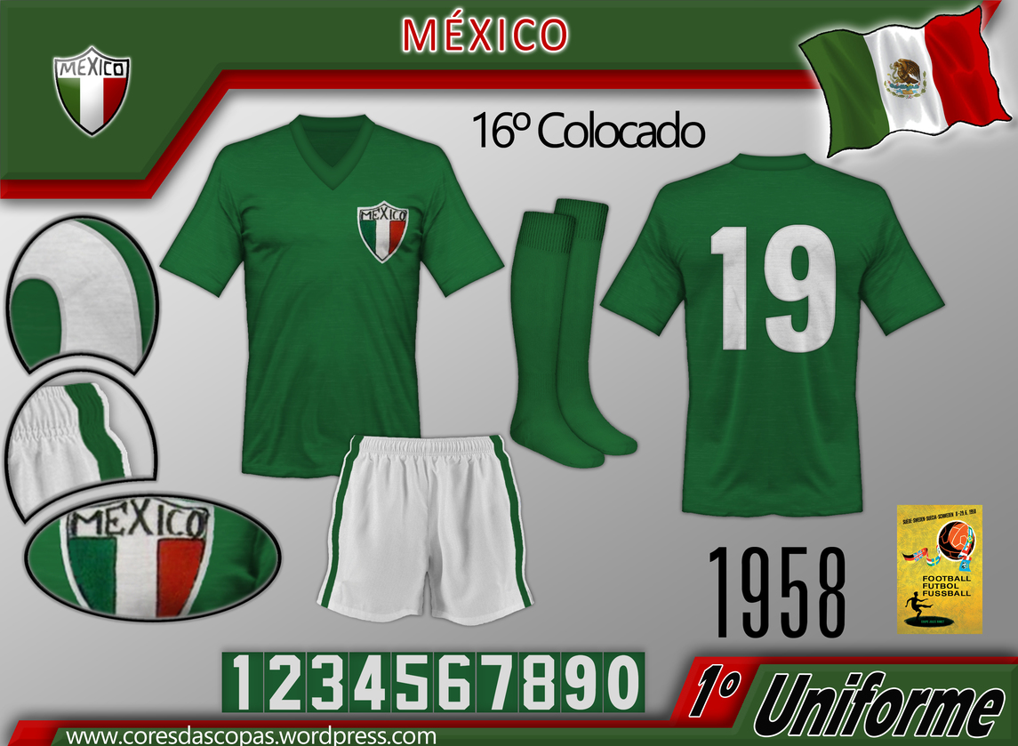 Esse uniforme foi usado nas partidas contra Brasil e Espanha, mas a primeira vitória mexicana na partida contra os tchecos foi conquistada com a camisa original Grená e o calção e as meias escuras que então eram usados como uniforme reserva.