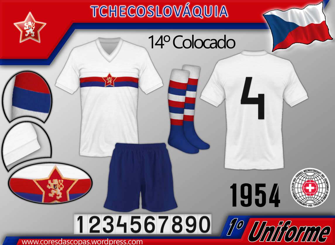 Contra a Alemanha os Tchecos usaram o seu uniforme reserva, com a camisa vermelha o calção branco e as meias listradas.